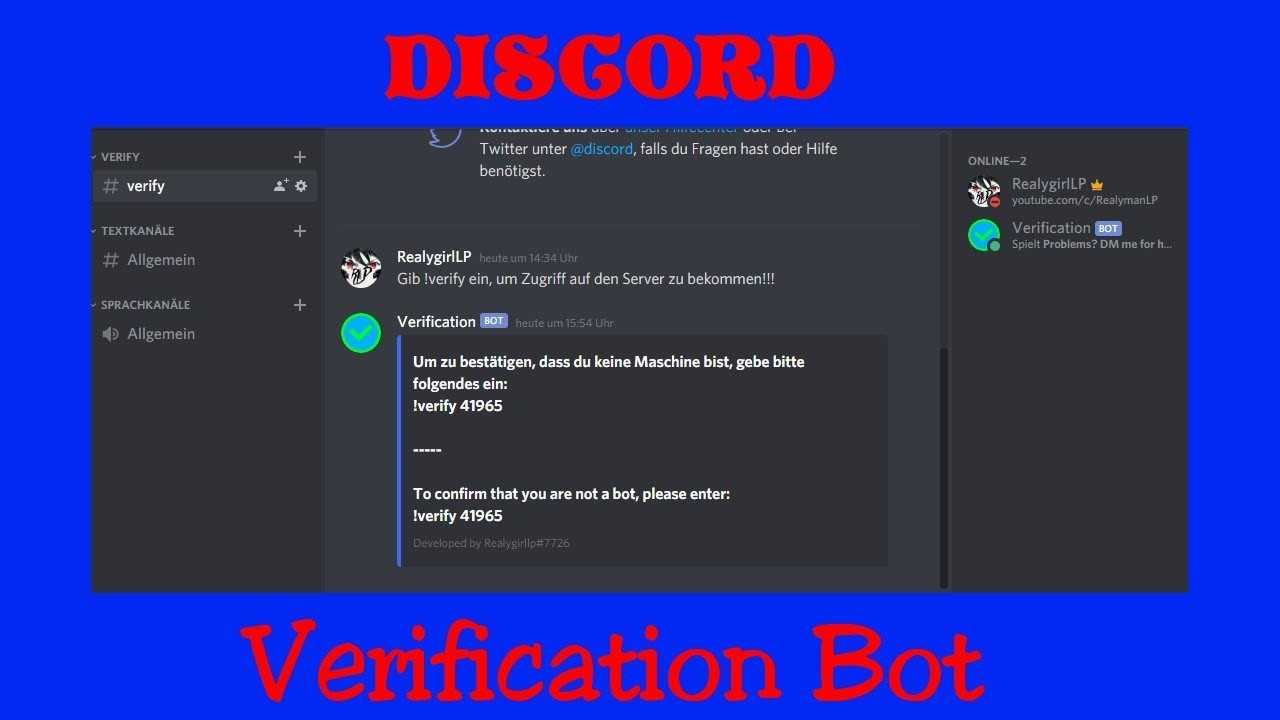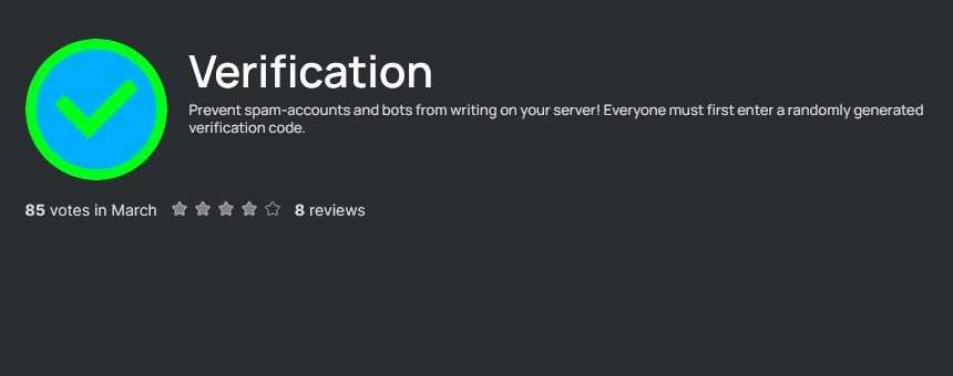Verification bot для Discord — это дополнение, позволяющее защитить сервер от атак спамеров. Дополнение временно запрещает доступ к каналу для неподтвержденных пользователей. Для получения доступа им потребуется подтвердить свой аккаунт посредством ввода кода, сгенерированного случайным образом. За счет этого сервер становится защищенным от ботов, рассылающих спам-сообщения.