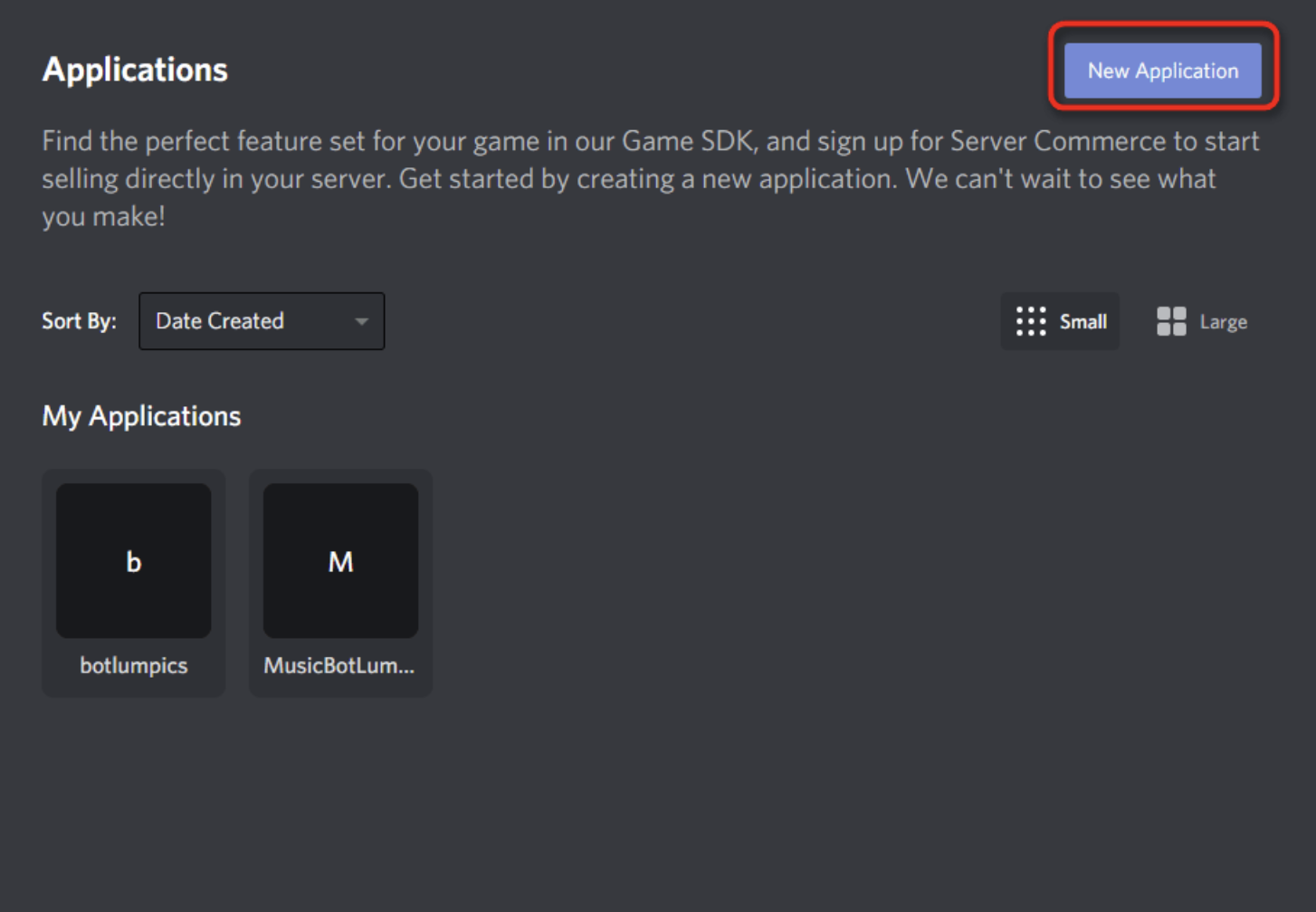 - Нажмите на кнопку «New Application» (Новое приложение), чтобы создать новое приложение бота.