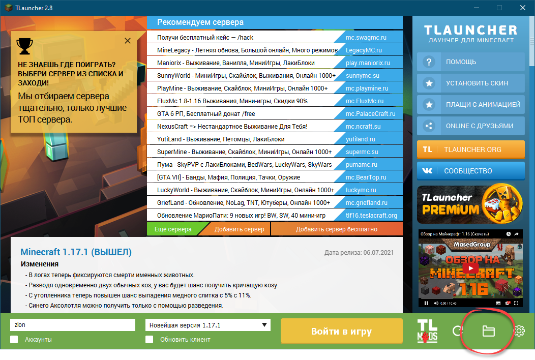 К папке с модами можно перейти и через лаунчер. В правом нижнем углу TLauncher есть иконка с изображением папки. Нажав на неё попадаем сразу же в папку Майнкрафт.