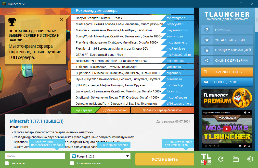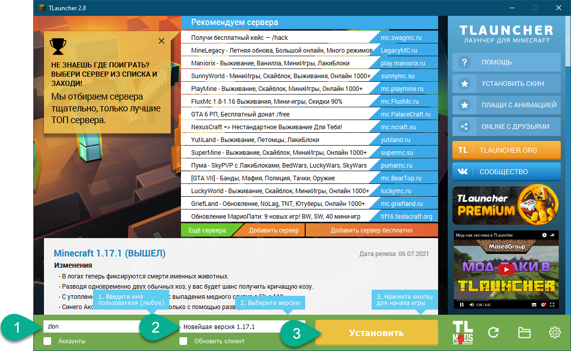 Первое, что нужно сделать сразу после установки лаунчера, это произвести инсталляцию игры. Для этого прописываем свой ник, выбираем нужную версию и жмем кнопку, отмеченную цифрой «3».