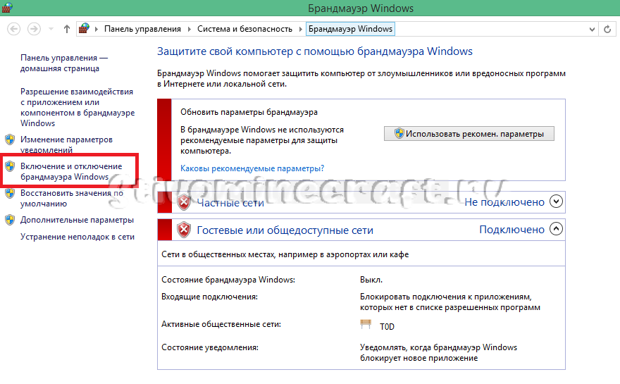 В левом меню выберите «Включение и отключение брандмауэра Windows».