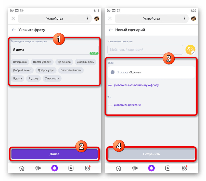 Укажите команду в поле «Фраза для запуска сценария», при произношении которой будет выполнено действие, и нажмите «Далее». При возращении на предыдущую страницу аналогичным образом воспользуйтесь ссылкой «Действие» и укажите Станцию в качестве устройства.