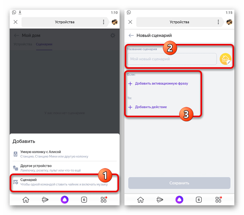 - С помощью приложения на телефоне можно создавать собственные команды, чтобы Алиса выполняла сразу несколько действий автоматически. Для этого откройте «Управление устройствами» в разделе «Устройства», перейдите на вкладку «Сценарии» и нажмите по значку «+» в правом нижнем углу экрана.