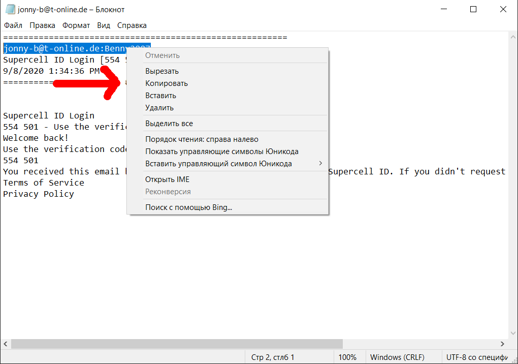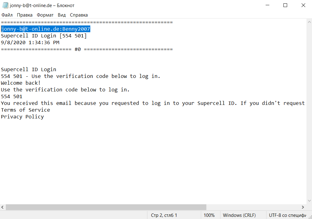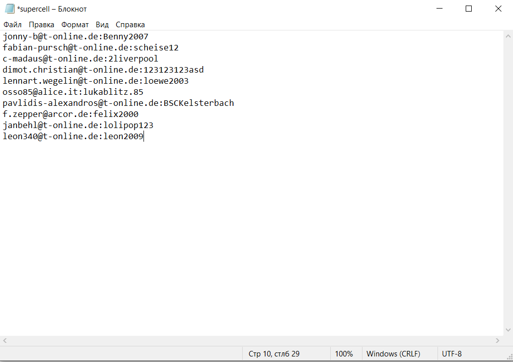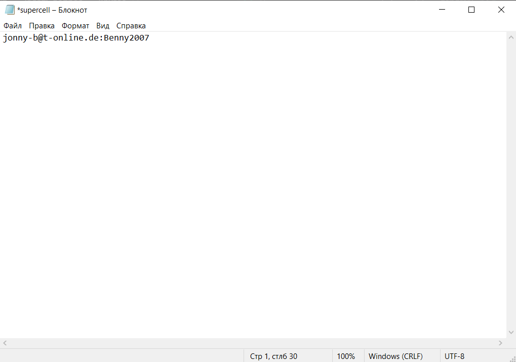 После чего заходим в папку с результатами, затем открываем файл, копируем mail:pass (jonny-b@t-online.de:Benny2007) и вставляем в созданный текстовый документ.