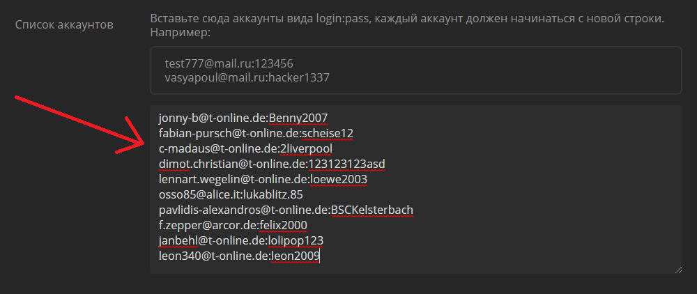 После того, как вы это заполнили, опускаемся ниже, здесь «список аккаунтов». Заходим в наш текстовик, копируем всё оттуда и вставляем всё сюда, как показано у меня.