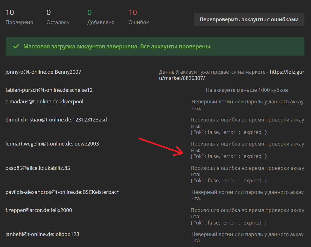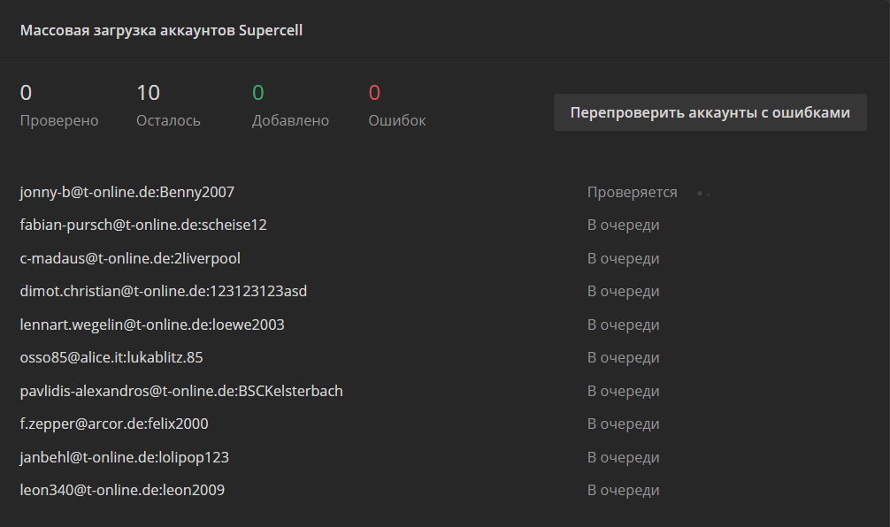 На выходе мы получаем наши потенциальные аккаунты. Но как проверить, рабочие они или нет?