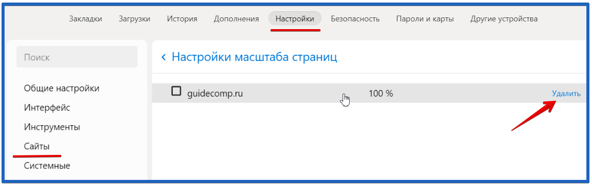 - Здесь появится список всех страниц с измененным масштабом. Изменить размер отсюда не получится, только сбросить, клацнув по «Удалить» напротив адреса.