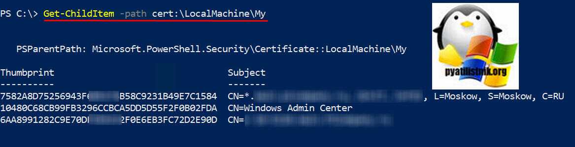 Если вам необходимо получить отпечаток сертификата через PowerShell, то запустите оболочку и введите команду: