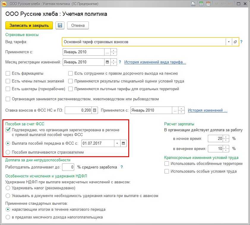 - в подразделе «Пособия за счет ФСС» проставляем галочку, подтверждая, что ваша организация зарегистрирована в регионе;