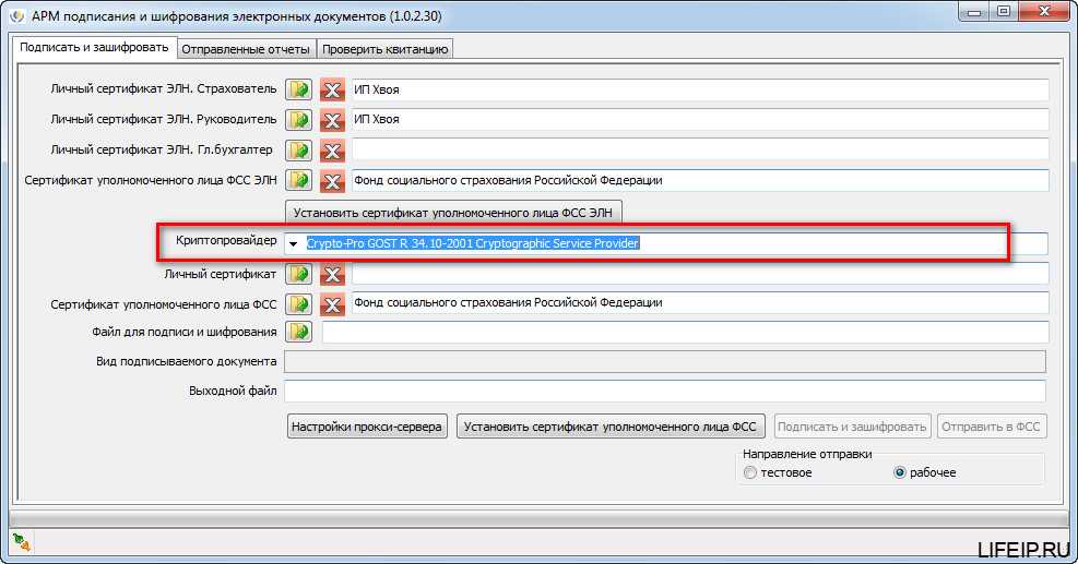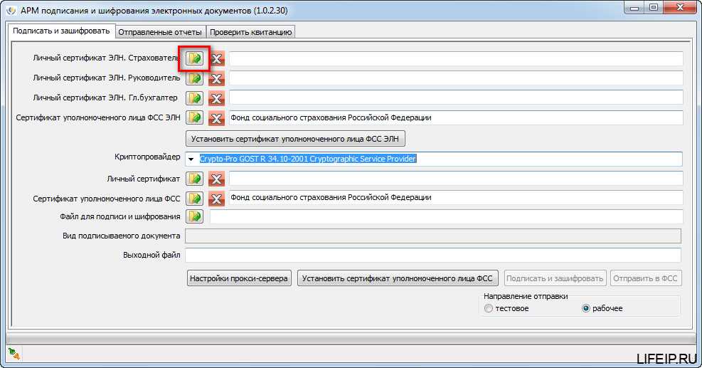 - Установить на компьютере сертификаты ФСС и сертификат ответственного лица организации (страхователя).