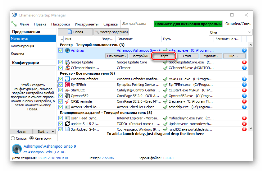 Еще один способ включить ранее отключенное приложение — использование платной утилиты (с возможностью попробовать триальную версию продукта) Chameleon Startup Manager. С ее помощью можно подробно просмотреть записи для реестра и служб, которые прикреплены в автозагрузке, а также изменить состояние каждого элемента.