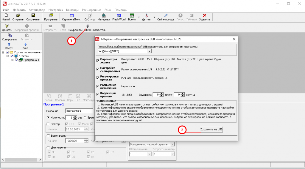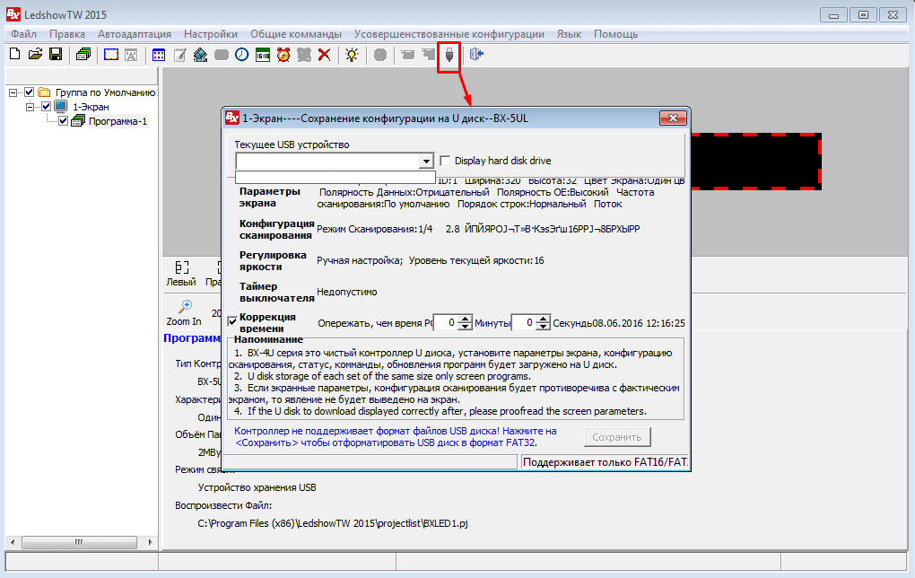 Отправка данных через карту памяти USB-flash (обычная флешка, отформатированная в формате FAT32). После подготовки программ для табло вставляем флешку в USB-порт и нажимаем на кнопку «Сохранение конфигурации на U-диск» в верхнем меню.