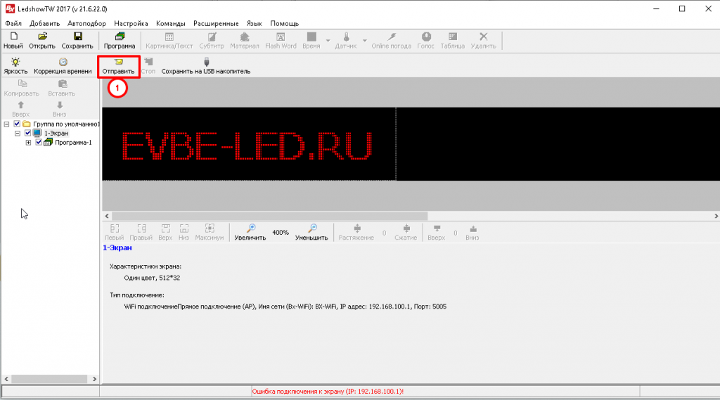 После подготовки программ для табло нажимаем на кнопку в верхнем меню.