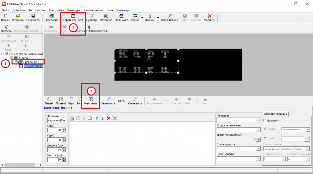 Нажимаем «Закрыть», возвращаемся в основной раздел. Последовательно кликаем «программа — 1», «картинка\текст» и потом «максимум» чтобы развернуть наше текстовое поле на всю строку