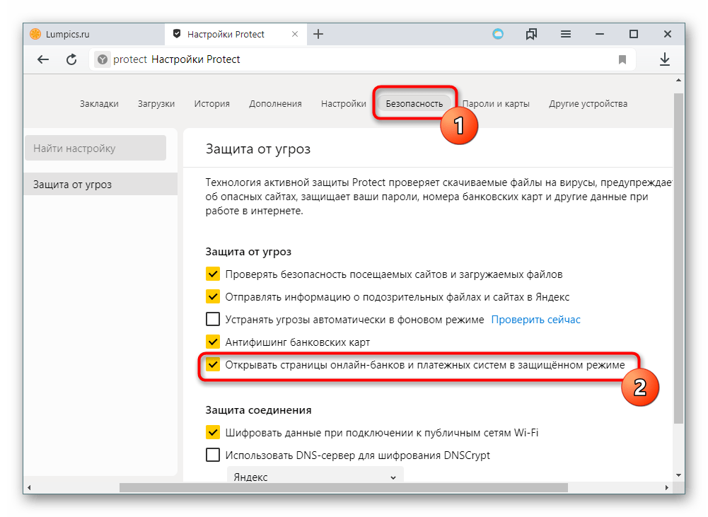 Как уже было сказано ранее, Protect запускается самостоятельно, но только при условии, что эта возможность активирована в его настройках. Проверить это можно, через кнопку меню перейдя в «Настройки» браузера, переключившись на вкладку «Безопасность» и поставив галочку напротив пункта «Открывать страницы онлайн-банков и платежных систем в защищенном режиме».