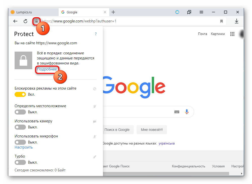 При успешном результате вы увидите изменение цвета шапки браузера, надпись «Защищенный режим», а если нажать на иконку замка еще раз, появится подтверждение активации безопасного режима, где его можно в любой момент выключить, кликнув по переключателю.
