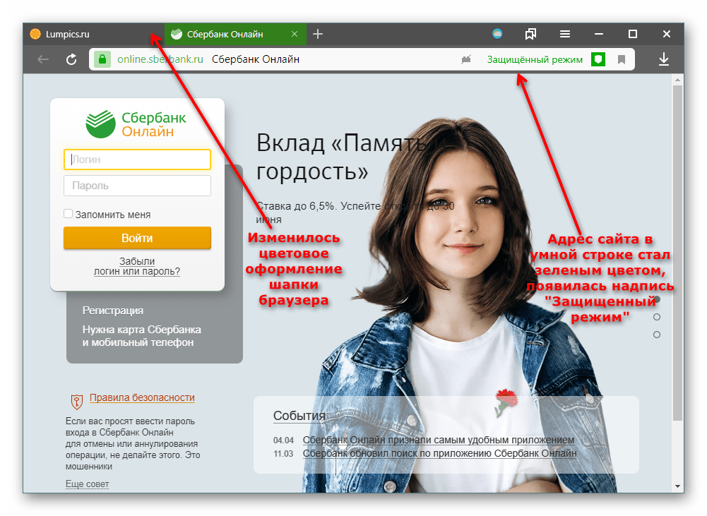 Он включается тогда, когда вы открываете страницы с веб-банкингом и платежными системами. Понять, что режим работает, можно по визуальным отличиям: вкладки и панель браузера из светло-серых превращаются в темно-серые, а в адресной строке появляется зеленый значок со щитом и соответствующая надпись. Ниже вы видите, как выглядит обычная страница интернет-сайта: