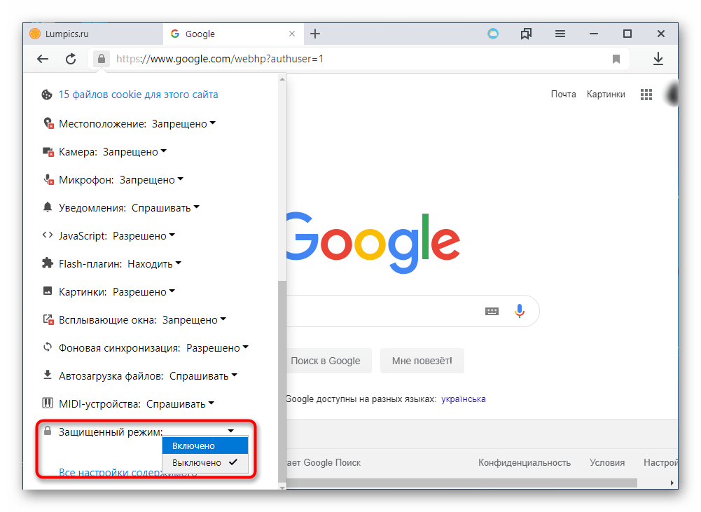 Опуститесь в самый низ всплывшего окошка и рядом с «Защищенный режим» измените состояние на «Включено».