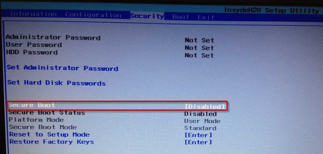 Первым делом следует отключить защиту. С этой целью переходим в раздел Security → Secure Boot и нажимаем Enter.