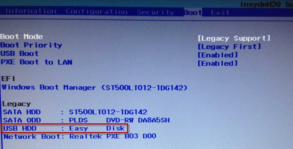 - С помощью кнопок вверх-вниз выделить накопитель «USB HDD» и установить его кнопками «F6» и «F5» в списке «Legacy» выше «SATA HDD». Стрелкой вниз переходим в раздел «Legacy» выделяем «USB HDD» и нажимаем «F5» и «F6», что бы выставить загрузочную флешку на первое место