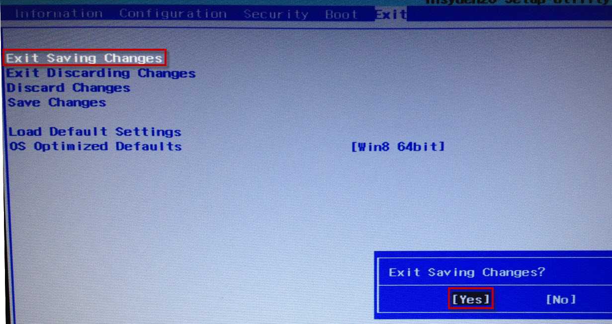 - Нажать кнопку «Esc», чтобы выйти в главное меню BIOS, и нажать кнопку «F10» для сохранения параметров выхода из BIOS. После рестарта ноутбука он начнет загружаться с USB-накопителя. Нажимаем кнопку «Esc», чтобы выйти в главное меню BIOS, нажимаем кнопку «F10» или переходим во вкладку «Exit»Для подтверждения действия выделяем кнопку «Yes», нажимаем «Enter»
