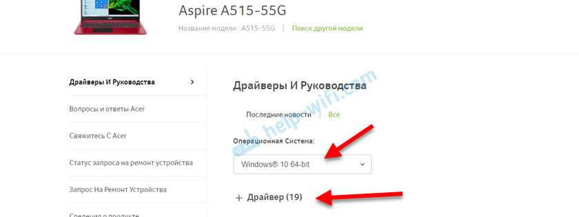 Вернемся к нашему примеру. Так как ноутбук у нас Acer Aspire 5 A515-55G, то заходим на сайт Acer. Находим там раздел с загрузками.