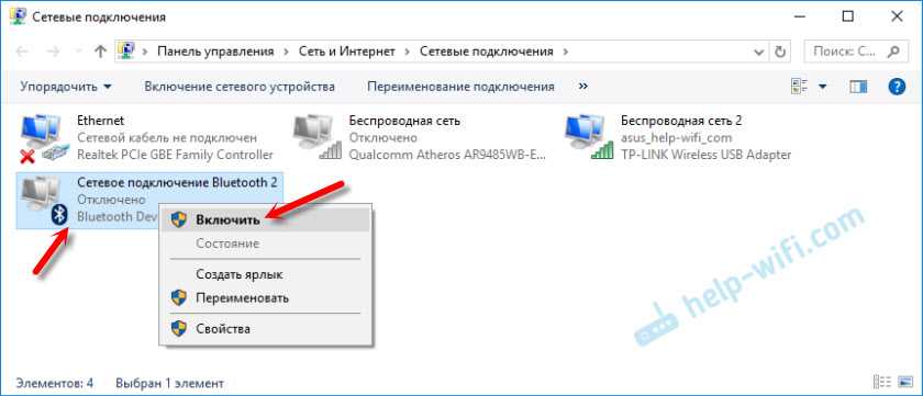 Если синей иконки на панели уведомлений нет, то перейдите в «Центр управления сетями и общим доступом» – «Изменение параметров адаптера» и посмотрите, есть ли там адаптер «Сетевое подключение Bluetooth». Если нет, то устанавливайте драйвер для своей модели ноутбука, или проверьте наличие адаптера в диспетчере устройств (об это ниже в статье). А если есть, то посмотрите, включен ли он. Возможно, его нужно включить на ноутбуке.