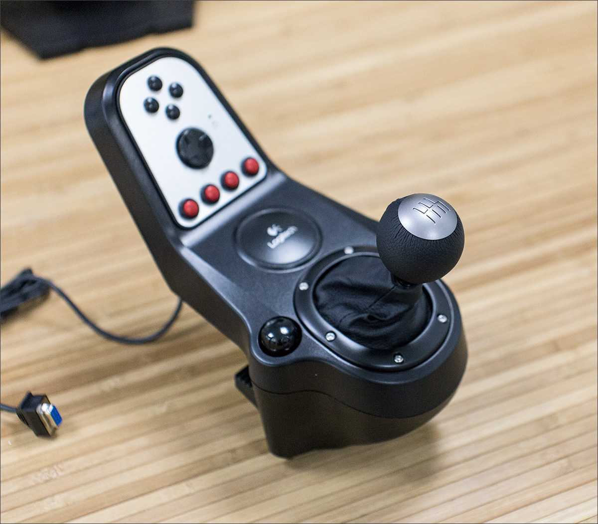 В ней 6 ступеней скоростей и ступень передачи заднего хода (также задний ход включается простым нажатием на рычаг — реверанс в сторону казуальных игроков). Помимо рычага девайс имеет верхнюю панель, где расположились 8 программируемых кнопок, сгруппированные по 4, а также крестообразный манипулятор D-pad, похожий на приставочный (удобно для работы в меню игр). Благодаря тому, что девайс можно настраивать полностью под себя, КПП G27 Racing Wheel можно устанавливать как слева от руля, так и справа, имитируя “праворульку”.