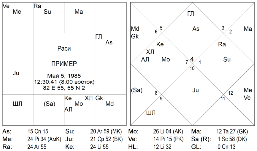 Вот так должен выглядеть гороскоп (карта Раси или Раши), который вы составили: слева он представлен в южно-индийском стиле, справа — в северо-индийском. Выглядят эти карты рождения по-разному, но в них заключена одна и та же информация, касающаяся одного и того же человека.