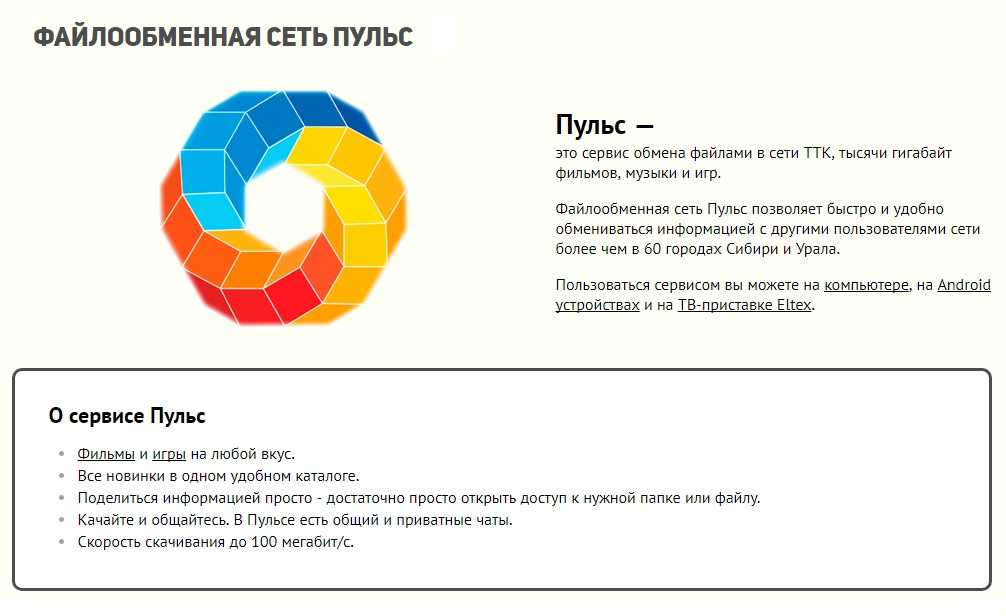 Pulse TTK — неограниченное количество трафика для скачивания фильмов, игр, мультимедии, а также общения и обмена информацией. В одном каталоге собраны все новинки, которыми вы с легкостью сможете поделиться. Откройте доступ к папкам и файлам, и о них узнают ваши друзья и знакомые. В список услуг файлообменной сети Пульс входит: