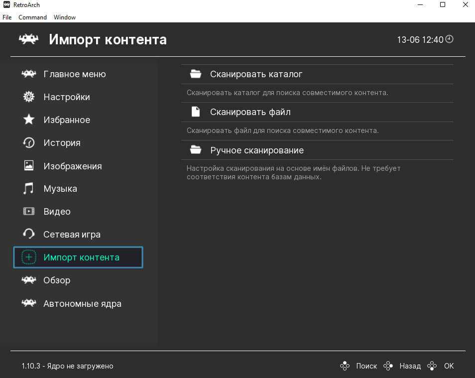 - В главном меню Retroarch выберите «Импорт содержимого».