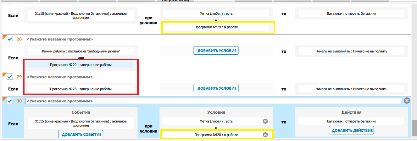 Добрый день, помогите с гибкой логикой. Нужно по событию нажатие кнопки багажника при условии наличия метки и условие что постановка в охрану выполнена свободными руками действие отпирание багажника. Как сделать, что бы логика по какому либо условию ни чего не делала бесконечно, но до условия или события её выключения? Разъясните работу условия пользователь в автомобиле, хотелось бы сделать, отпирание багажника когда метка не в автомобиле, а когда садишся в авто багажник не открывался.За раннее огромное спасибо!