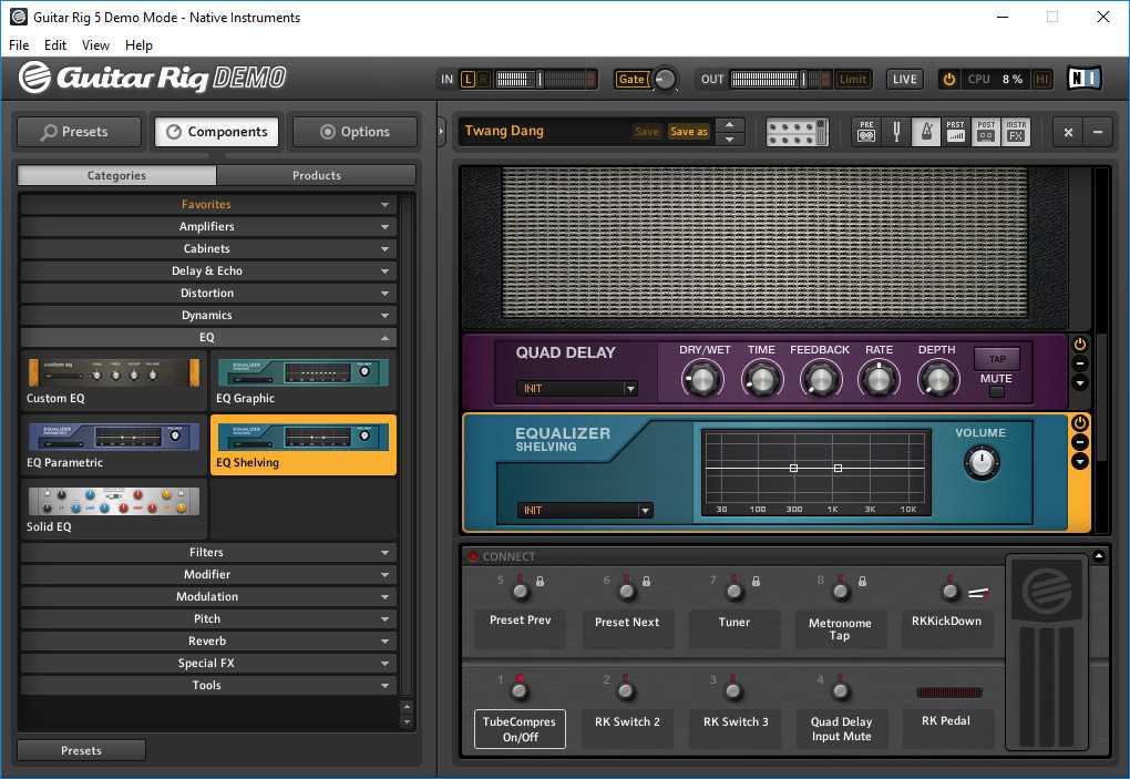 Под главным меню располагается панель с кнопками включения/отключения входных каналов, динамической обработки, индикацией и переключения в режим Live. В левой части окна программы располагается блок с пресетами, компонентами и настройками. Все пресеты в эмуляторе отсортированы по жанрам и направлениям, выбор шаблона осуществляется двойным кликом по соответствующему элементу списка в блоке «Preset Name». При этом в правую область рабочего пространства загружается цепь составляющих пресет эффектов с которыми и ведется основная работа.
