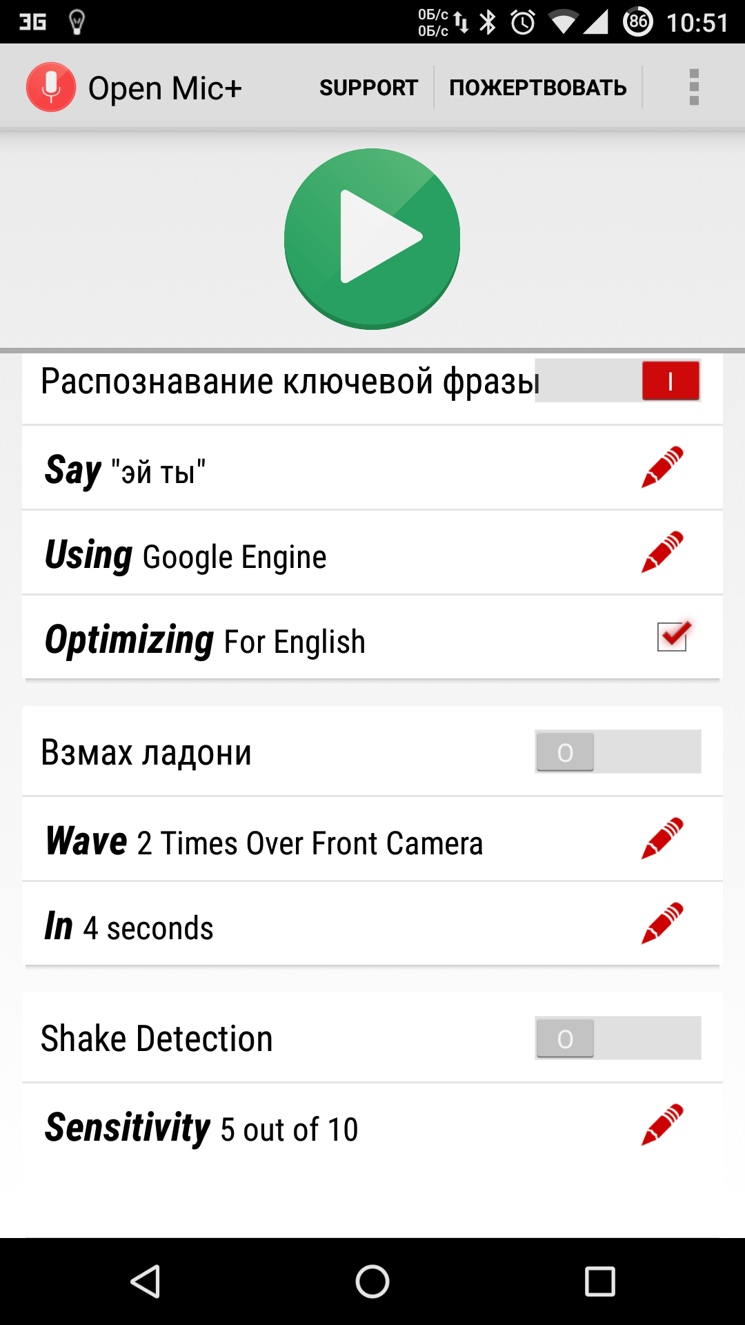Тем не менее разработчик обещает все поправить в следующих обновлениях. Из других функций можно отметить запуск распознавания по датчику приближения (два взмаха руки) и по встряске телефона. Как и MOTO X, поддерживает распознавание при выключенном экране, но, к сожалению, это очень сильно отражается на батарее, поэтому актуально для телефона на зарядке или автомобильных медиацентров на Android с постоянным питанием. Работает с Bluetooth-гарнитурой, имеет интеграцию с Таскером, может зачитывать текстовые сообщения.