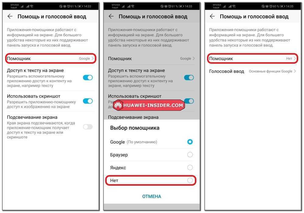• На устройствах с операционной системой Android 7 Nougat зайти в меню настроек системы, раздел «Приложения» и нажмите на кнопку в виде шестеренки на верхней панели. В открывшемся окне выберите «Помощник и голосовой ввод» -> «Помощник» и во всплывающем меню: пункт «Нет».