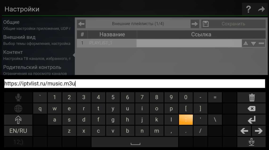 - В меню «Настройки» заходим в «Контент», кликаем «Добавить» и вводим ссылку на плейлист. В нашем случае – https://iptvlist.ru/music.m3u