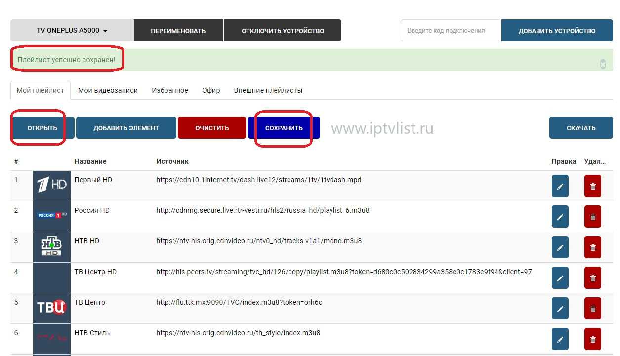 - Кликаем кнопку «Открыть» и выбираем скачанный ранее плейлист ( в нашем случае https://iptvlist.ru/ru.m3u ), кликаем «Сохранить» и видим подтверждение, что наш плейлист сохранен