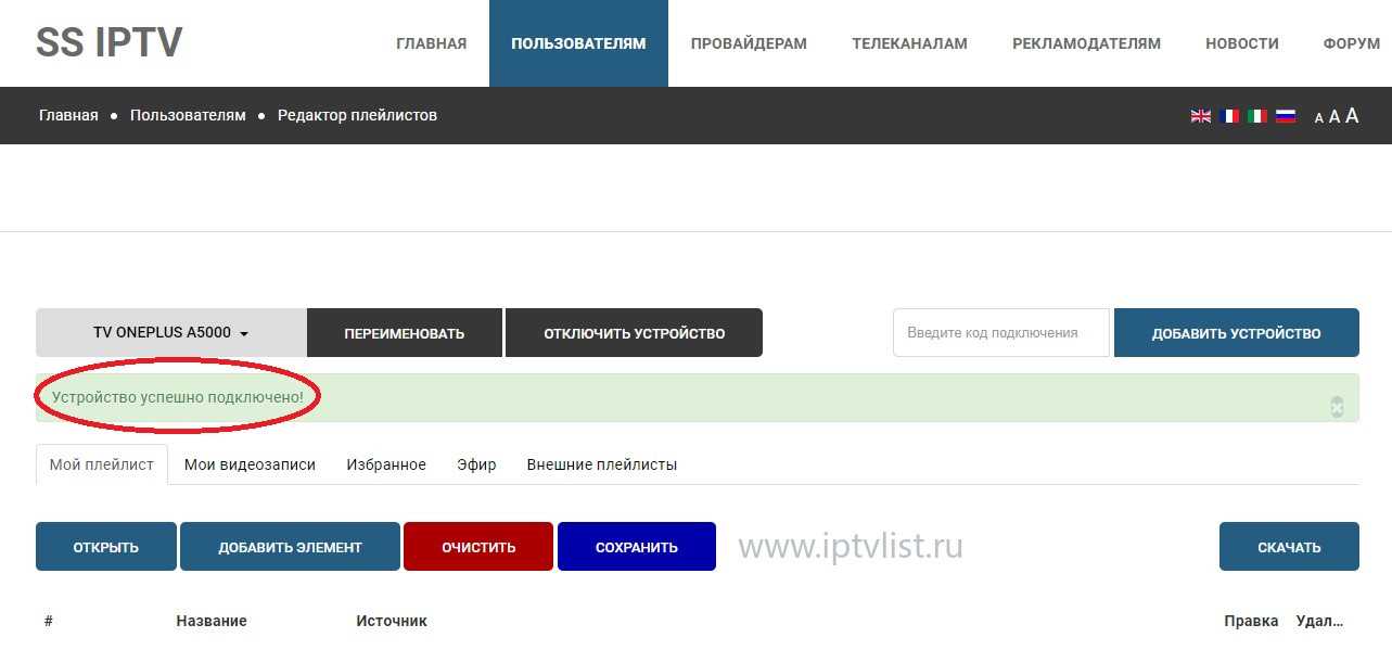 - Сгенерированный код вводим на странице https://ss-iptv.com/ru/users/playlist и кликаем «ДОБАВИТЬ УСТРОЙСТВО» и получаем подтверждение «Устройство успешно подключено»