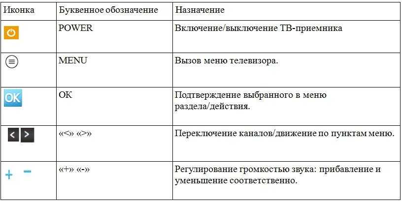 Расположение кнопок управления на ТВ-приемниках разных марок и моделей отличается, но назначение и обозначение этих элементов схожее. Приведем расшифровку в таблице ниже.