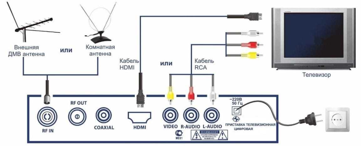 Текущая задача – подключить все кабеля к приставке и телевизору, чтобы осталась только программная настройка. Мы подразумеваем, что антенна установлена правильно (рекомендации смотрите здесь), подобран и подключен подходящий кабель для соединения приставки и старого телевизора.