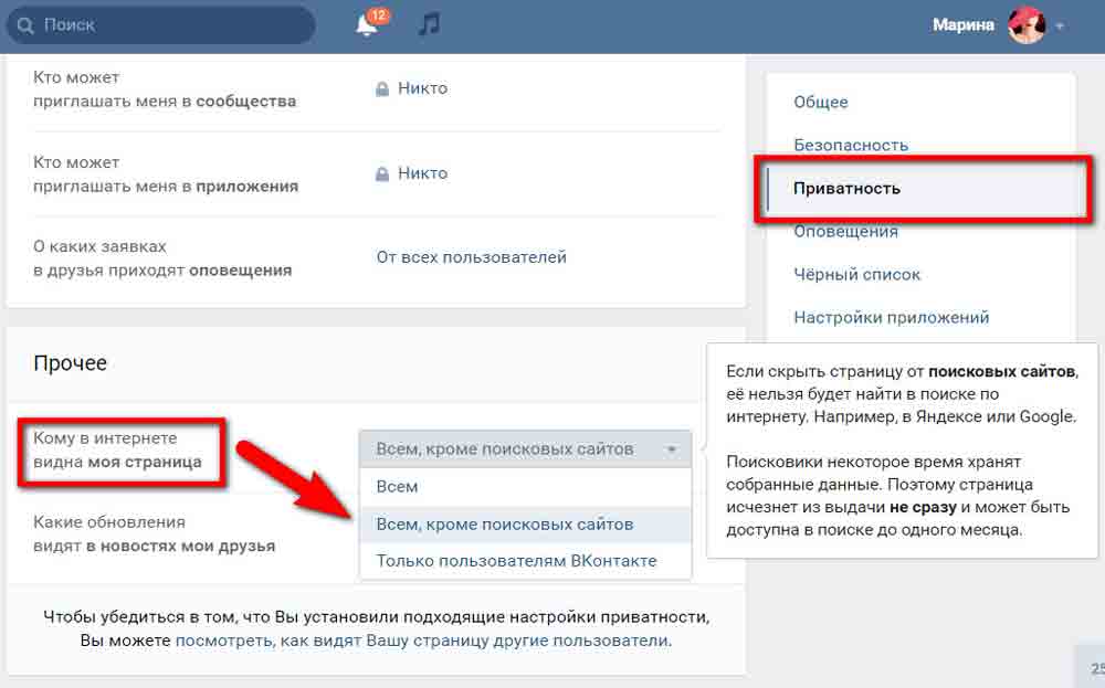 Раздел приватности изменяет уровень доступа посторонних к данным профиля. Дополнительные настройки ВКонтакте, связанные с конфиденциальностью, позволяют скрыть фото, подарки и аудиозаписи, открыть комментирование стены только друзьям или закрыть сообщения.