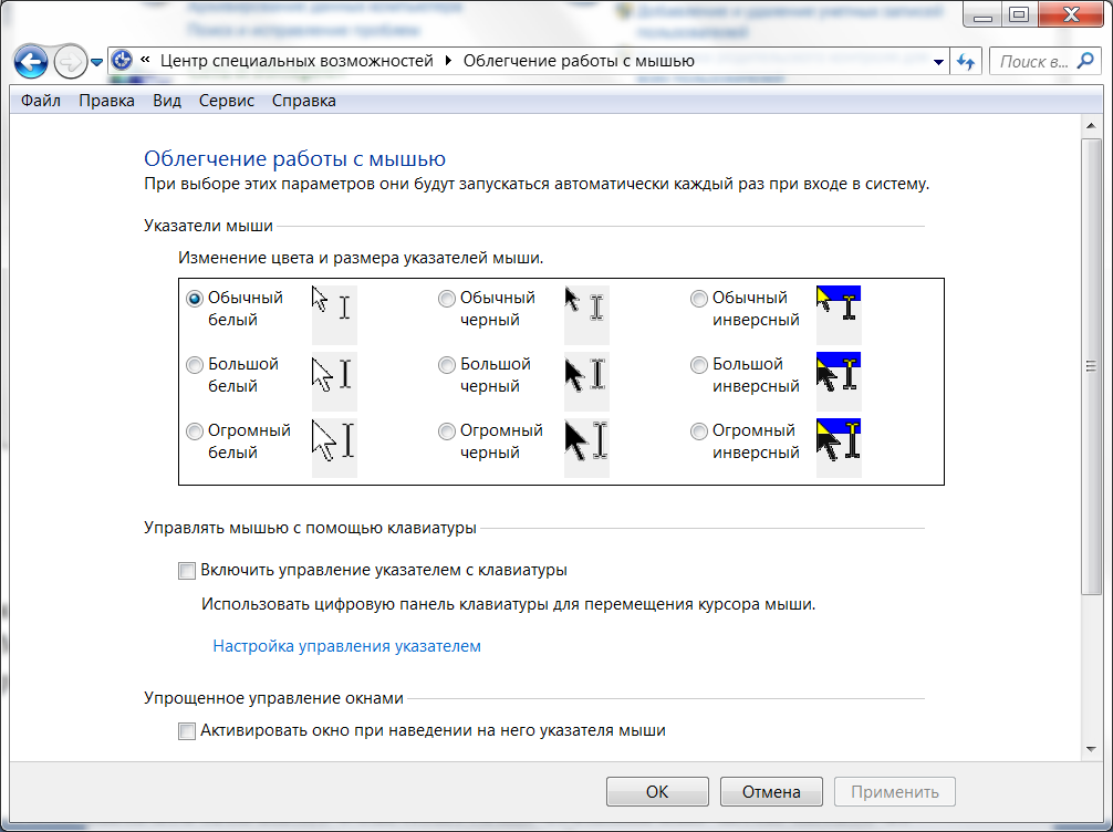 В открытом окне видим набор самых оптимальных настроек, среди которых отдельным блоком выделены поправки, касающиеся цвета, размера и оттенка курсора.