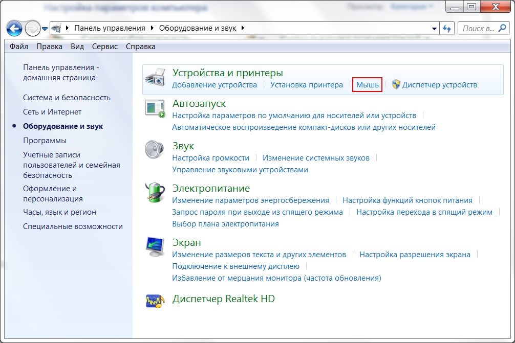 Для того, чтобы перейти к настройкам манипулятора в Windows, необходимо пройти по пути: «Пуск» — «Панель управления» — «Оборудование и звук». Далее на экране отобразится окно, в котором необходимо отыскать ссылку «Мышь» и кликнуть по ней.