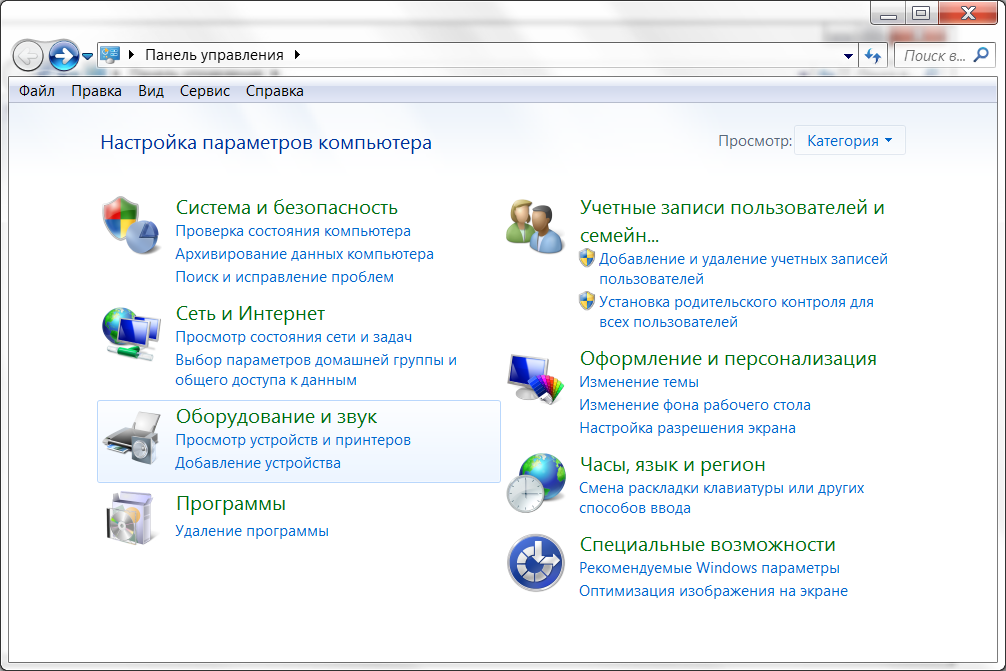 Далее выбрать раздел «Оборудование и звук», с помощью которого пользователь может добавлять или удалять оборудование, ставить на него различные пакеты драйверов и в частности перенастраивать его функционал.