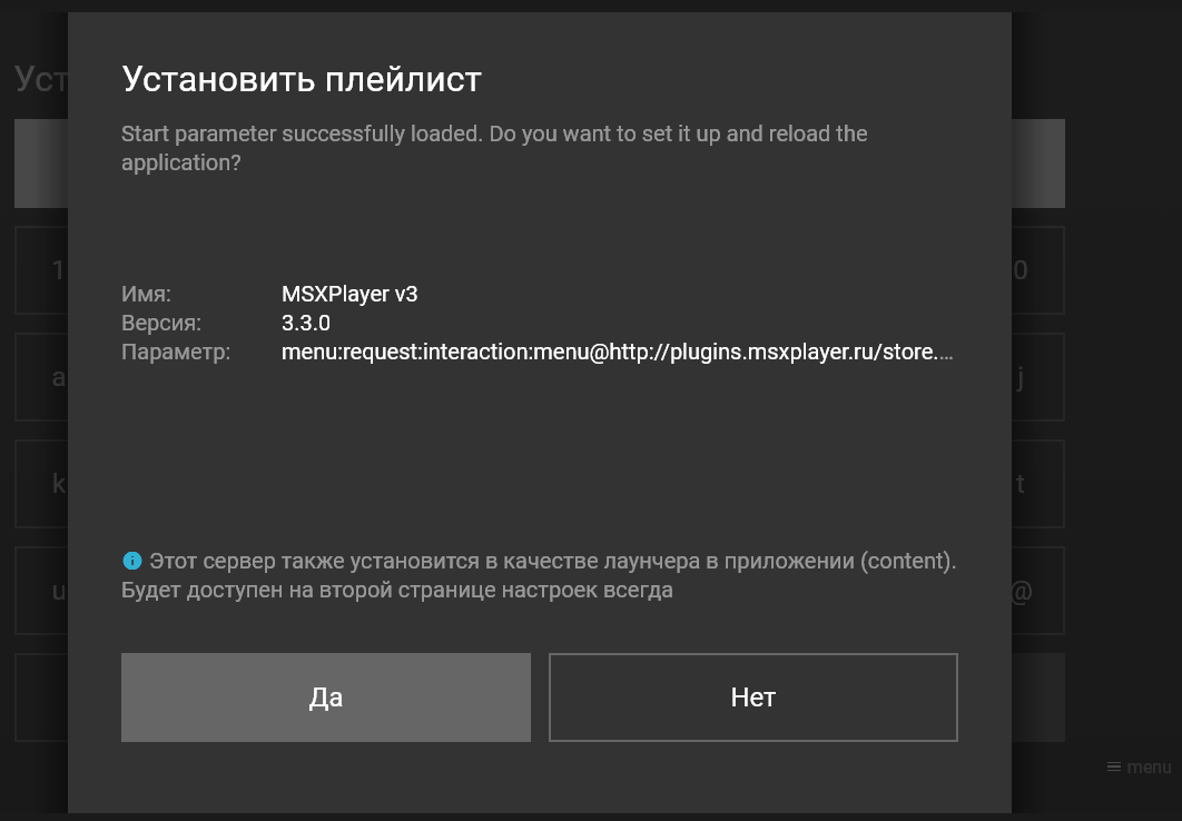 - Вставьте адрес плагина и подтвердите кнопкой “Назад” на ПДУ.