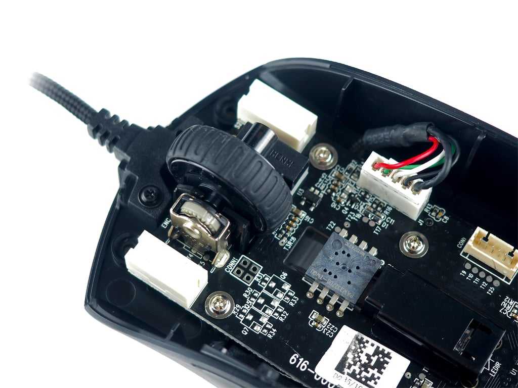 Колесо скроллинга удобное, прорезиненное и широкое. Энкодер фирмы TTC имеет 24 позиции, которые легко переключаются во время игры. Нажим легкий, слышен громкий щелчок.