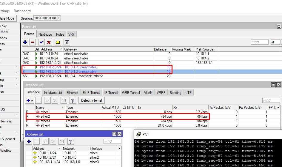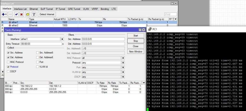 В Dst. Address указываем сеть/адрес назначения. Gateway указываем IP шлюза или интерфейс, через который можем передавать данные. Метрику обычно изменяю, т.к. в будущем может понадобится создавать более приоритетные. Если мы сейчас отправим ping запросы с PC1 на PC2, то ответов мы не увидим.