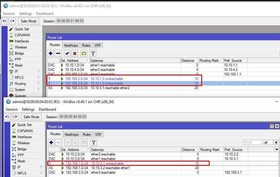 И смотрим как маршруты на R1 и R3 с метрикой 10, стали unreachable.