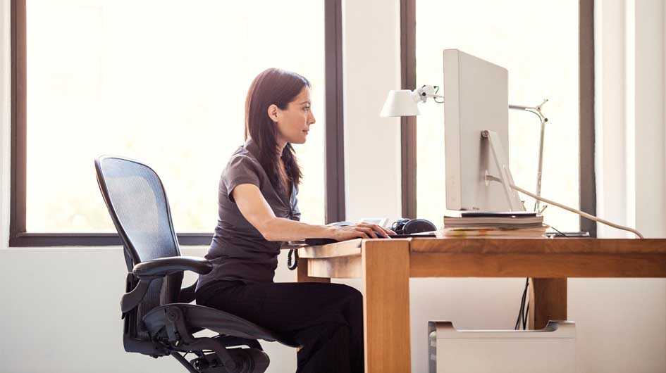 Чтобы определить правильное положение тела в офисном кресле, необходимо следовать трем простым правилам. Во-первых, центр монитора компьютера рекомендовано располагать прямо на уровне глаз человека: чтобы прочитать с экрана необходимую информацию не должно возникать необходимости двигать шеей. Во-вторых, нужно ощущать хорошую поддержку изгиба поясницы. В-третьих, расстояние от задней части голени до переднего края сиденья должно составлять не больше 5 см. Чтобы проверить это, достаточно сжать кулак и посмотреть, насколько свободно он проходит между ними. Если кулак протискивается с затруднением или вовсе не помещается, то спинку нужно пододвинуть вперед. Если же расстояние между голенями и краем кресла слишком большое, то ее двигают назад.