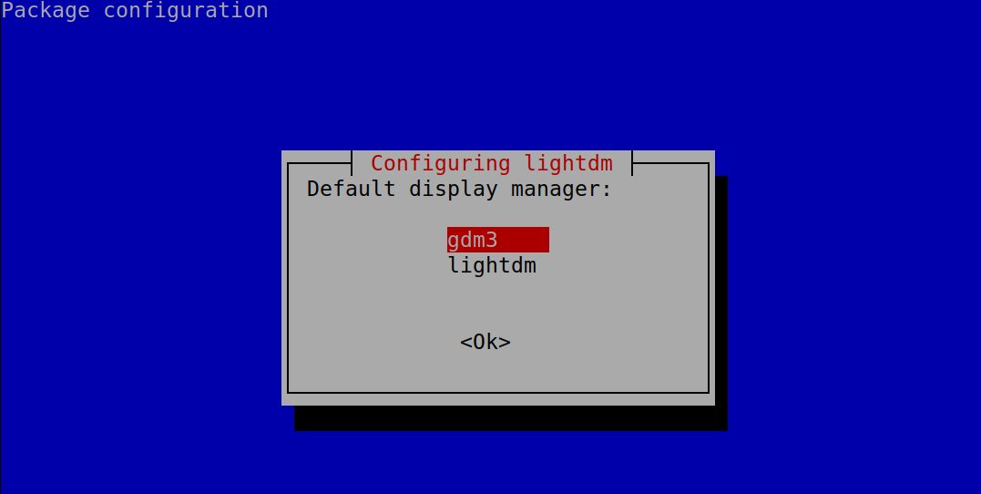 Once GDM is installed, you can set it using the command dpkg-reconfigure, as shown in the example below.